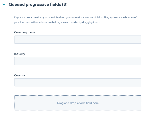 After you set those fields, you can add form fields to the section below that, called “Queued Progressive Fields.” This section is where we’ll possibly add additional TOFU fields or MOFU form fields. We can add our selected form fields to the queued fields, like this: