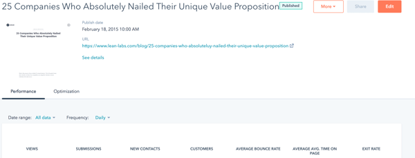 We can see how a Lean Labs blog post from 2015 continues to drive traffic and leads back to our site. We can measure the performance of all of our blog posts, getting as granular as we need to. In HubSpot, navigating this data is easy, but would take a lot of work in another system.